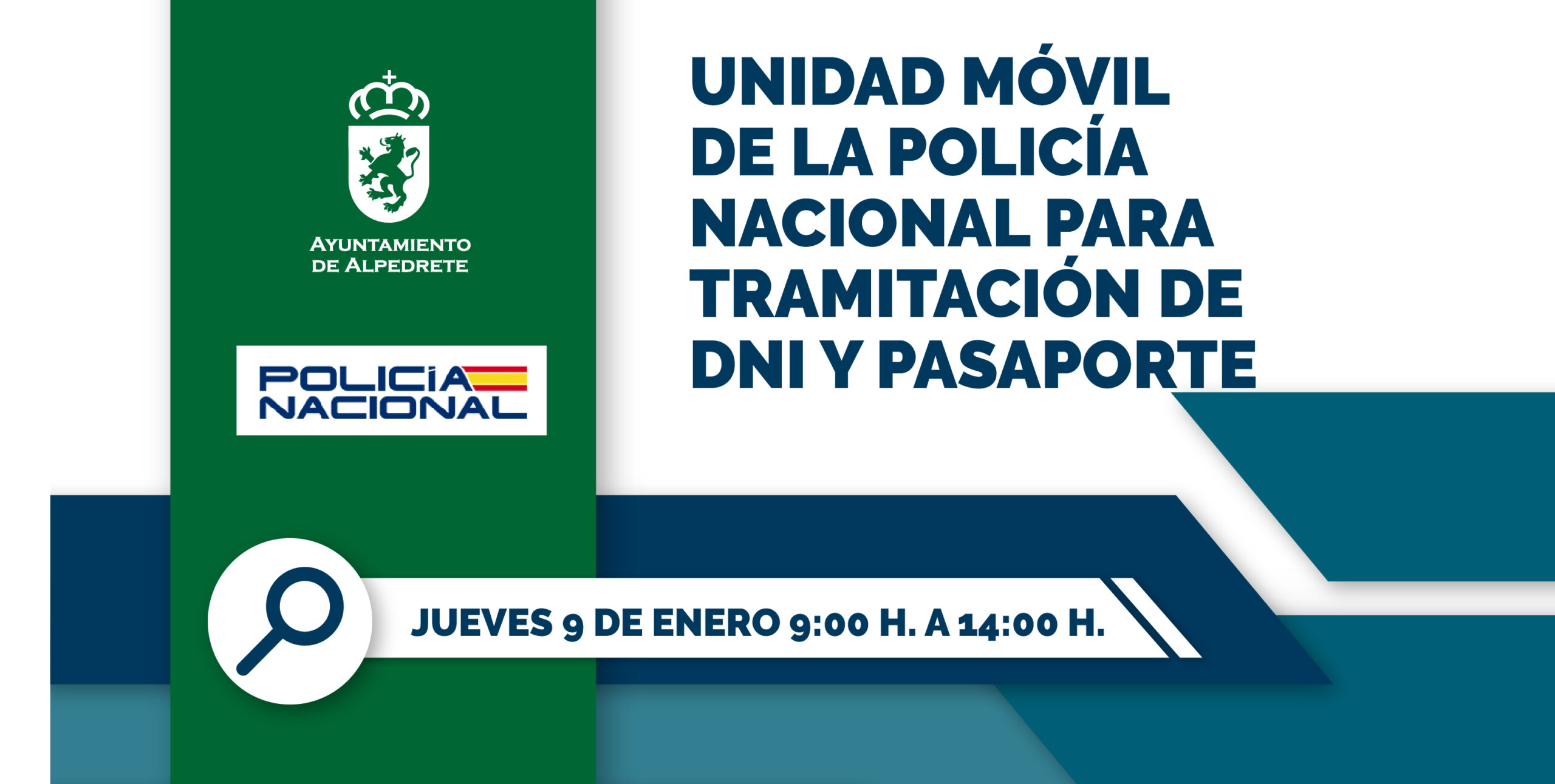 La unidad móvil de la Policía Nacional se trasladará a Alpedrete el próximo 9 de enero para facilitar la tramitación del Documento Nacional de Identidad (DNI) y del pasaporte a los ciudadanos sin necesidad de acudir a una comisaría convencional. El servicio estará disponible en la Plaza de la Villa en horario de 9:00 a 14:00 horas y, para poder ser atendido, es imprescindible contar con una cita previa, la cual se puede gestionar llamando al teléfono de la Policía Local: 600 50 03 12.